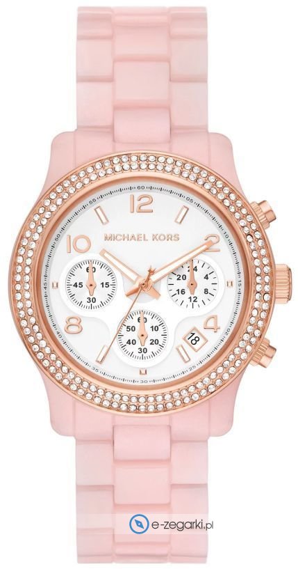 Zasilanie zegarka MK7424 to klasyczna bateria kwarcowa. Pasek w tonacji koloru różowego wykonany jest z wysokiej jakości tworzywa sztucznego.