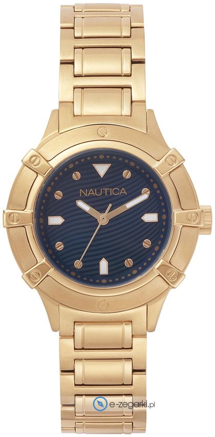Model NAPCPR005 marki Nautica to gustowny zegarek naręczny damski, który posiada ciekawe rozwiązania oraz funkcje. Ciekawy wygląd zegarka osiągnięto m.in. poprzez tarczę w kolorze niebieskim. Godzina zaprezentowana jest w sposób analogowy co bez trudu pozwala ją odczytać. Koperta jest w kolorze złotym szeroka jest na 36 mm - w kształcie okrągłym.