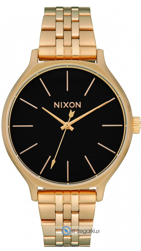 Zegarek damski A1249-513 marki Nixon to stylowe połączenie funkcjonalności oraz modnego designu. Model ten zalicza się do serii Nixon Base Clique. Wysokiej jakości tarczę zegarka pokryto czarnym kolorem. Zegarek ten prezentuje aktualny czas w formacie analogowym dzięki czemu odczyt jest intuicyjny. Koperta w barwach koloru złotego szeroka jest na 38 mm oraz ma grubość 8 mm - wyróżnia się okrągłym kształtem.