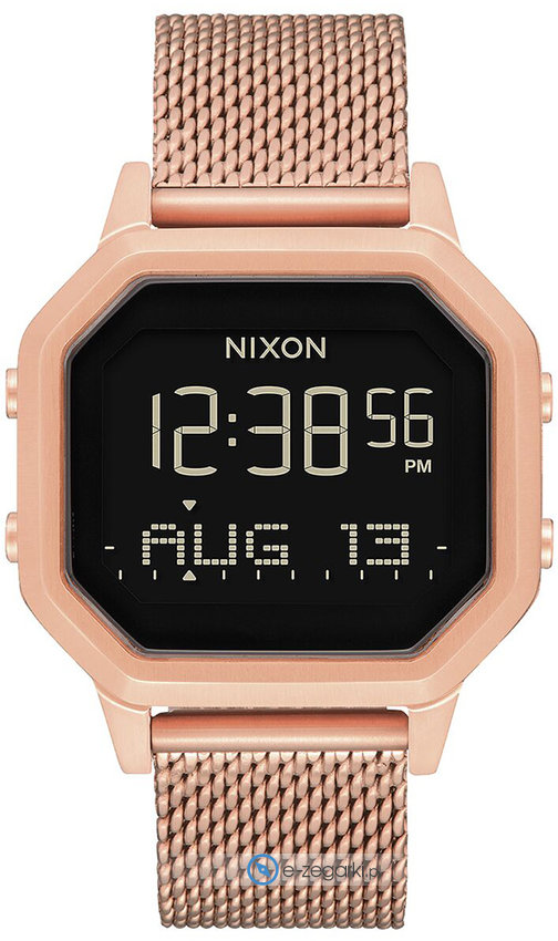 Zegarek damski A1272-897 z serii Nixon Siren Milanese marki Nixon. Niestereotypowy wygląd czasomierza osiągnięto także dzięki tarczy w kolorze czarnym. Zegarek ten prezentuje godzinę w formacie cyfrowym dzięki temu odczyt jest intuicyjny. Koperta szeroka jest na 36 mm oraz ma grubość 11 mm.