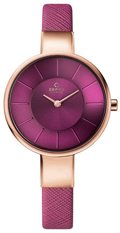 Model V149LVQRD marki Obaku to gustowny zegarek naręczny damski, który posiada pomysłowe rozwiązania i funkcje. Cyferblat zegarka jest w kolorze fioletowym. Pokazana metodą analogową aktualna godzina jest czytelna i prosta do odczytania. Koperta szeroka jest na 32 mm oraz ma grubość 6 mm - w kształcie okrągłym.