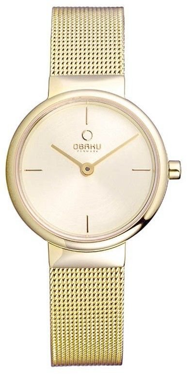 Zegarek damski V153LGGMG marki Obaku to stylowe połączenie funkcjonalności oraz ciekawego designu. Wysokiej jakości tarczę zegarka pokryto złotym kolorem. Godzina zaprezentowana jest w sposób analogowy co niezmiernie łatwo pozwala ją odczytać. Koperta jest w kolorze złotym szeroka jest na 26 mm oraz ma grubość 7 mm - wyróżnia się okrągłym kształtem.
