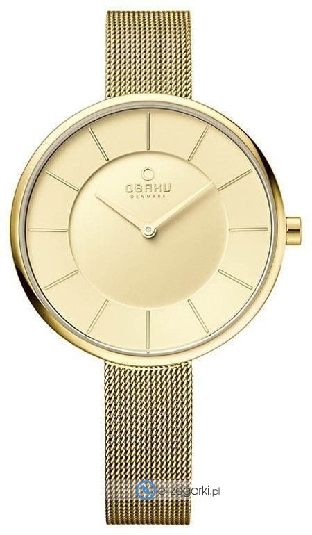 Model V185LXGGMG marki Obaku to stylowy zegarek naręczny damski, który posiada ciekawe rozwiązania oraz funkcje. Nieschematyczny wygląd zegarka uzyskano również dzięki tarczy w kolorze złotym. Pokazana metodą analogową bieżąca godzina jest czytelna i łatwa do sprawdzenia. Koperta jest w kolorze złotym szeroka jest na 38 mm oraz ma grubość 6 mm - w kształcie okrągłym.