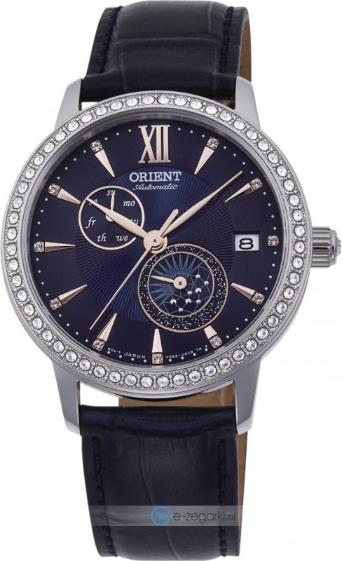 Model RA-AK0006L10B marki Orient to stylowy zegarek naręczny damski, który wyposażono w ciekawe rozwiązania oraz funkcje. Charakter zapewnia wysokiej jakości tarcza w kolorze granatowym. Aktualna godzina prezentowana jest w sposób analogowy co bez trudu pozwala ją odczytać. Koperta jest pokryta kolorem srebrnym szeroka jest na 37 mm oraz ma grubość 12 mm - cechuje się okrągłym kształtem.