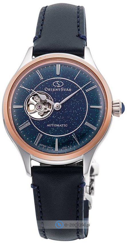 Model RE-ND0014L00B marki Orient Star to gustowny zegarek naręczny damski, który wyposażono w pomysłowe rozwiązania oraz funkcje. Ciekawy wygląd czasomierza osiągnięto m.in. poprzez cyferblat w kolorze granatowym. Godzina zaprezentowana jest w sposób analogowy co intuicyjnie pozwala ją odczytać. Koperta została ozdobiona kolorem srebrno złotym szeroka jest na 30 mm - ma okrągły kształt.