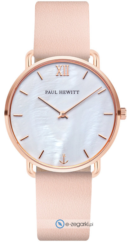 Model PH-M-R-P-30S marki Paul Hewitt to elegancki zegarek naręczny damski, który wyposażono w ciekawe rozwiązania oraz funkcje. Niebanalną budowę czasomierza uzyskano z pomocą tarczy w kolorze białym. Zaprezentowana metodą analogową aktualna godzina jest czytelna i łatwa do odczytania. Koperta jest w kolorze różowo złotym szeroka jest na 33 mm oraz ma grubość 7 mm - charakteryzuje się okrągłym kształtem.