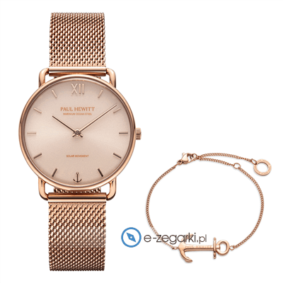 Zegarek damski PH-SET-0379 marki Paul Hewitt to idealne połączenie funkcjonalności oraz ciekawego wzornictwa. Godzina pokazywana jest w sposób analogowy co intuicyjnie pozwala ją odczytać. Koperta została pokryta kolorem złotym szeroka jest na 33 mm - posiada okrągły kształt.