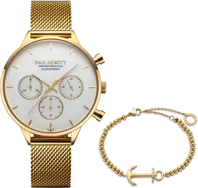 Zegarek damski PH-SET-0388 marki Paul Hewitt to stylowe połączenie funkcjonalności i modnego designu. Wysokiej trwałości tarczę zegarka pokryto białym kolorem. Godzina prezentowana jest w sposób analogowy co intuicyjnie pozwala ją odczytać. Koperta jest pokryta kolorem złotym szeroka jest na 40 mm - w kształcie okrągłym.