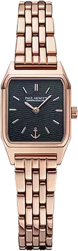Model PH-W-0336 marki Paul Hewitt to stylowy zegarek naręczny damski, który posiada ciekawe rozwiązania oraz funkcje. Styl zapewnia wysokiej jakości tarcza w kolorze czarnym. Zegarek ten pokazuje aktualny czas w formacie analogowym dzięki temu odczyt jest intuicyjny. Koperta w odcieniach koloru różowo złotego szeroka jest na 20 mm oraz ma grubość 5 mm - ma prostokątny kształt.