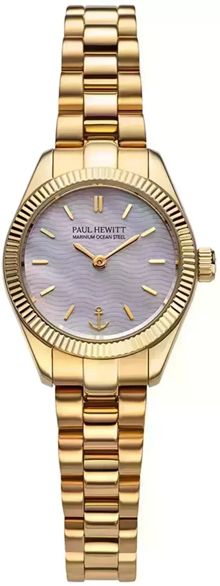 Damski zegarek Paul Hewitt PH-W-1184 to zegarek, który dzięki swemu wzornictwu zawsze będzie prezentował się dobrze. Wysokiej jakości cyferblat zegarka ozdobiono perłowym kolorem. Zegarek ten prezentuje aktualny czas w formacie analogowym dzięki temu odczyt jest bardzo łatwy. Koperta jest w kolorze złotym szeroka jest na 25 mm oraz ma grubość 8 mm - cechuje się okrągłym kształtem.