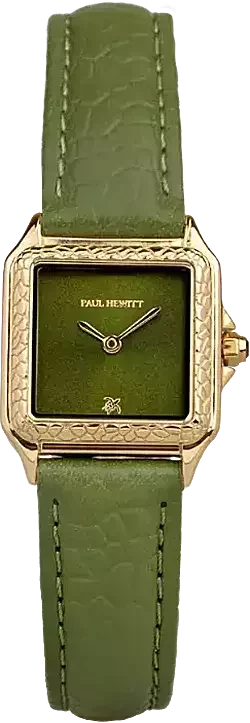 Model PH-W-2022 marki Paul Hewitt to stylowy zegarek naręczny damski, który wyposażono w ciekawe rozwiązania i funkcje. Wysokiej jakości cyferblat zegarka ozdobiono zielonym kolorem. Pokazana metodą analogową aktualna godzina jest czytelna i szybka do odczytania. Koperta została ozdobiona kolorem złotym szeroka jest na 21 mm.