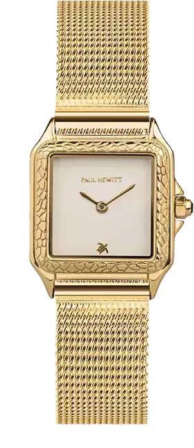 Model PH-W-2027 marki Paul Hewitt to stylowy zegarek naręczny damski, który wyposażono w ciekawe rozwiązania oraz funkcje. Charakteru nadaje wysokiej klasy tarcza w kolorze białym. Zegarek ten prezentuje aktualny czas w formacie analogowym dzięki temu odczyt jest intuicyjny. Koperta w barwach koloru złotego szeroka jest na 21 mm.