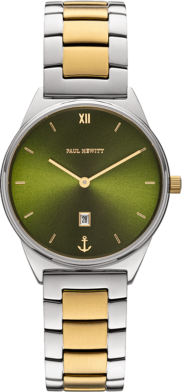 Model PH003777 marki Paul Hewitt to stylowy zegarek naręczny damski, który posiada pomysłowe rozwiązania i funkcje. Wysokiej jakości cyferblat zegarka ozdobiono zielonym kolorem. Godzina pokazywana jest w sposób analogowy co bez trudu pozwala ją odczytać. Koperta jest ozdobiona kolorem srebrnym szeroka jest na 33 mm - cechuje się okrągłym kształtem.