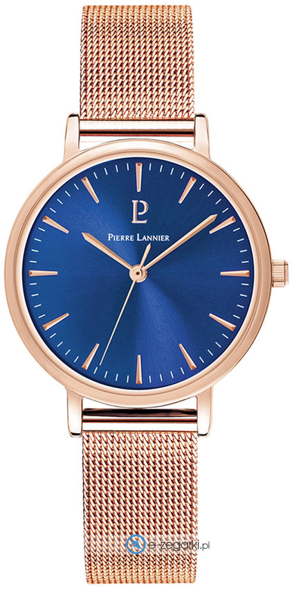 Model 091L968 marki Pierre Lannier to elegancki zegarek naręczny damski, który wyposażono w ciekawe rozwiązania i funkcje. Niebanalny wygląd zegarka uzyskano m.in. poprzez tarczę w kolorze niebieskim. Godzina przedstawiona jest w sposób analogowy co intuicyjnie pozwala ją odczytać. Koperta jest w kolorze różowo złotym szeroka jest na 33 mm oraz ma grubość 8 mm - wyróżnia się okrągłym kształtem.