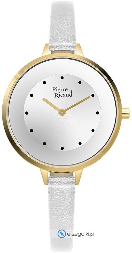 Zegarek damski P22039.1743Q marki Pierre Ricaud to idealne połączenie funkcjonalności oraz modnego wzornictwa. Wysokiej jakości tarczę zegarka pokryto białym kolorem. Zaprezentowana metodą analogową bieżąca godzina jest czytelna i prosta do odczytania. Koperta została ozdobiona kolorem złotym szeroka jest na 36 mm oraz ma grubość 8 mm - posiada okrągły kształt.