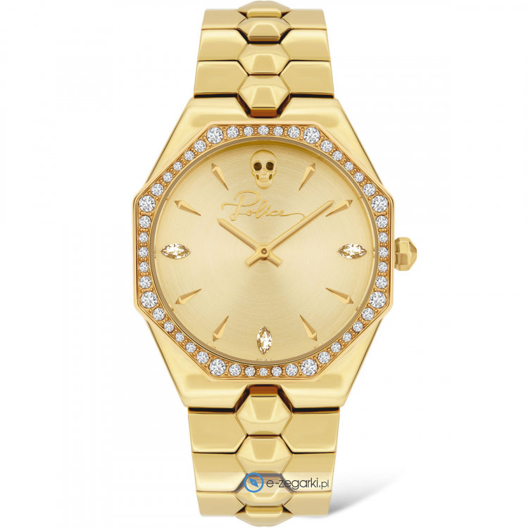 Model PL.16038BSG/22M marki Police to stylowy zegarek naręczny damski, który jest wyposażony w ciekawe rozwiązania oraz funkcje. Atrakcyjną konstrukcję zegarka uzyskano z pomocą tarczy w kolorze złotym. Zegarek ten prezentuje godzinę w formacie analogowym dzięki czemu odczyt jest bezproblemowy. Koperta jest w kolorze złotym szeroka jest na 35 mm - cechuje się ośmiokątnym kształtem.