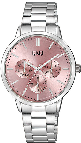 Zegarek damski A04A-002P marki Q&Q to stylowe połączenie funkcjonalności i modnego wzornictwa. Niebanalną budowę zegarka uzyskano dzięki tarczy w kolorze różowo złotym. Zaprezentowana metodą analogową bieżąca godzina jest czytelna i prosta do odczytania. Koperta jest ozdobiona kolorem srebrnym szeroka jest na 38 mm oraz ma grubość 9 mm - wyróżnia się okrągłym kształtem.