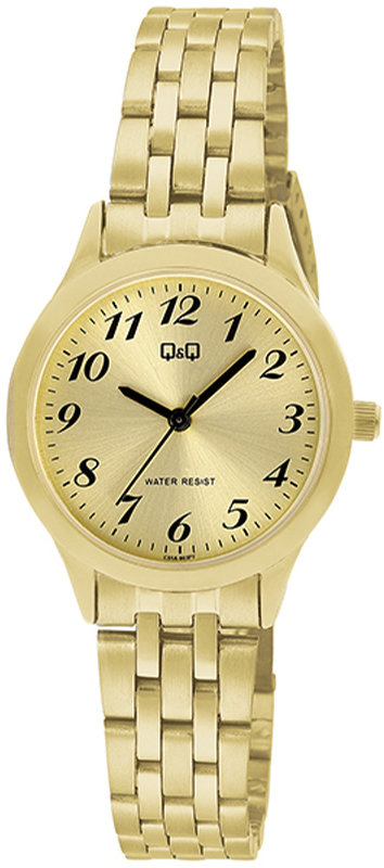 Zegarek damski C01A-003P marki Q&Q to stylowe połączenie funkcjonalności oraz modnego designu. Ciekawą budowę zegarka osiągnięto dzięki tarczy w kolorze złotym. Pokazana metodą analogową bieżąca godzina jest czytelna i prosta do odczytania. Koperta jest w kolorze złotym szeroka jest na 30 mm oraz ma grubość 7 mm - posiada okrągły kształt.