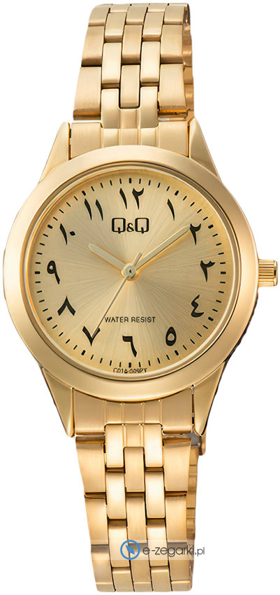 Zegarek damski C01A-009P marki Q&Q to dobre połączenie funkcjonalności a także ciekawego designu. Charakteru dodaje wysokiej jakości tarcza w kolorze złotym. Zegarek ten prezentuje godzinę w formacie analogowym dzięki temu odczyt jest bardzo łatwy. Koperta jest w kolorze złotym szeroka jest na 30 mm oraz ma grubość 8 mm - posiada okrągły kształt.