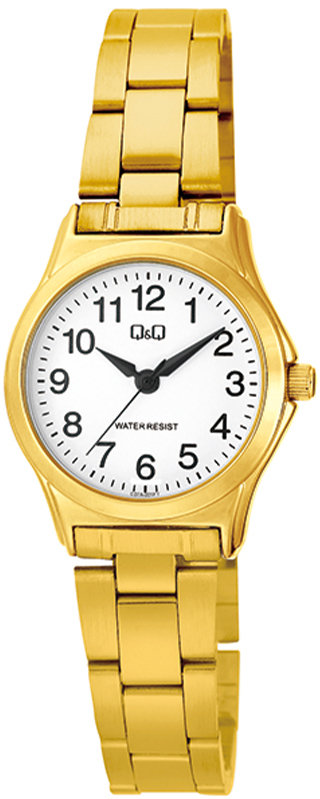 Damski zegarek Q&Q C07A-001P to zegarek, który dzięki swemu wzornictwu zawsze będzie prezentował się dobrze. Niebanalną budowę czasomierza osiągnięto z pomocą tarczy w kolorze białym. Pokazana metodą analogową bieżąca godzina jest czytelna i łatwa do sprawdzenia. Koperta jest w kolorze złotym szeroka jest na 28 mm oraz ma grubość 7 mm - w kształcie okrągłym.