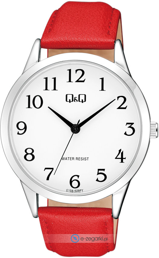 Zegarek C10A-029P posiada kwarcowy mechanizm zasilany tradycyjną baterią. Pasek czerwonego koloru zrobiony jest z wysokiej klasy skóry zapewniającej trwałość i wygodę użytkowania.