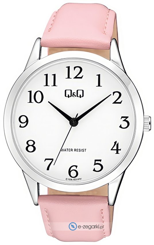 Model C10A-031P posiada mechanizm zasilany standardową baterią kwarcową. Pasek w odcieniach koloru różowego wykonany jest z wysokiej klasy skóry gwarantującej trwałość i komfort użytkowania.