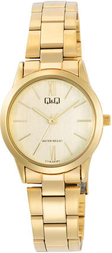 Zegarek C11A-031P posiada kwarcowy mechanizm zasilany standardową baterią. Bransoleta w tonacji koloru złotego wykonana jest z wysokiej jakości stopu metali na bazie mosiądzu.