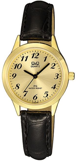 Zegarek damski C153-103 marki Q&Q to stylowe połączenie funkcjonalności oraz modnego wzornictwa. Ciekawy wygląd czasomierza uzyskano także dzięki tarczy w kolorze szampańskim. Aktualna godzina przedstawiona jest w sposób analogowy co intuicyjnie pozwala ją odczytać. Koperta jest w kolorze złotym szeroka jest na 30 mm - cechuje się okrągłym kształtem.