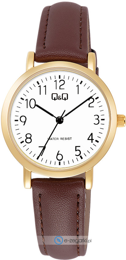 Damski zegarek Q&Q C35A-010P to zegarek, który dzięki swemu wzornictwu zawsze będzie prezentował się dobrze. Styl zapewnia wysokiej jakości tarcza w kolorze białym. Godzina zaprezentowana jest w sposób analogowy co bez trudu pozwala ją odczytać. Koperta jest w kolorze złotym szeroka jest na 31 mm oraz ma grubość 8 mm - wyróżnia się okrągłym kształtem.