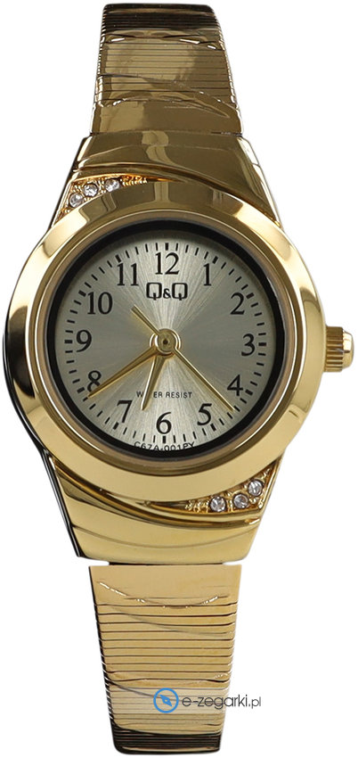 Zegarek damski C67A-001P marki Q&Q to dobre połączenie funkcjonalności oraz ciekawego designu. Ciekawą budowę zegarka osiągnięto z pomocą tarczy w kolorze złotym. Aktualna godzina przedstawiona jest w sposób analogowy co bez trudu pozwala ją odczytać. Koperta jest w kolorze złotym szeroka jest na 20 mm oraz ma grubość 7 mm - w kształcie okrągłym.