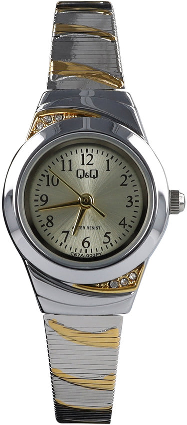 Model C67A-003P marki Q&Q to gustowny zegarek naręczny damski, który wyposażono w pomysłowe rozwiązania i funkcje. Niestereotypowy wygląd czasomierza osiągnięto również dzięki tarczy w kolorze złotym. Aktualna godzina pokazywana jest w sposób analogowy co bez trudu pozwala ją odczytać. Koperta jest ozdobiona kolorem srebrnym szeroka jest na 20 mm oraz ma grubość 7 mm - posiada okrągły kształt.