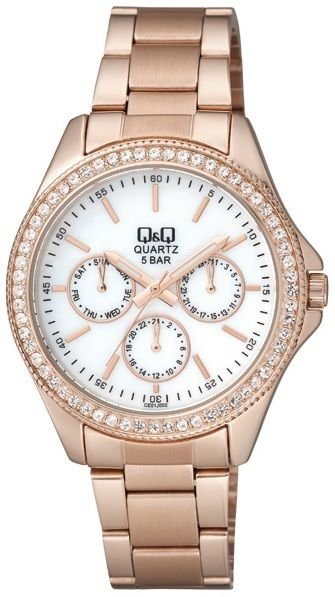 Model CE01-002 marki Q&Q to gustowny zegarek naręczny damski, który posiada pomysłowe rozwiązania oraz funkcje.