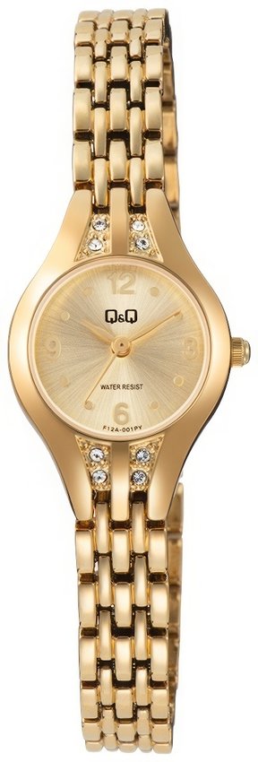 Model F12A-001P marki Q&Q to elegancki zegarek naręczny damski, który jest wyposażony w pomysłowe rozwiązania oraz funkcje. Charakteru dodaje wysokiej jakości cyferblat w kolorze złotym. Zegarek ten pokazuje godzinę w formacie analogowym dzięki czemu odczyt jest intuicyjny. Koperta jest pokryta kolorem złotym szeroka jest na 22 mm oraz ma grubość 7 mm - posiada okrągły kształt.