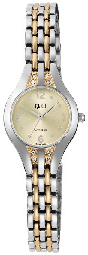 Zegarek damski F12A-003P marki Q&Q to idealne połączenie funkcjonalności a także modnego wzornictwa. Stylu dodaje wysokiej jakości tarcza w kolorze złotym. Zegarek ten prezentuje aktualny czas w formacie analogowym dzięki czemu odczyt jest bardzo łatwy. Koperta w barwach koloru srebrnego szeroka jest na 22 mm oraz ma grubość 7 mm - w kształcie okrągłym.