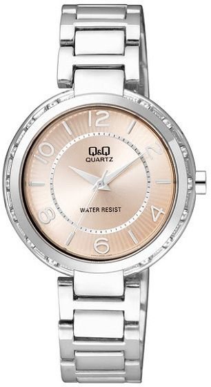 Zegarek damski F531-205 marki Q&Q to stylowe połączenie funkcjonalności oraz modnego wzornictwa. Charakteru nadaje wysokiej jakości tarcza w kolorze różowo złotym. Aktualna godzina przedstawiona jest w sposób analogowy co niezmiernie łatwo pozwala ją odczytać. Koperta jest w kolorze srebrnym.