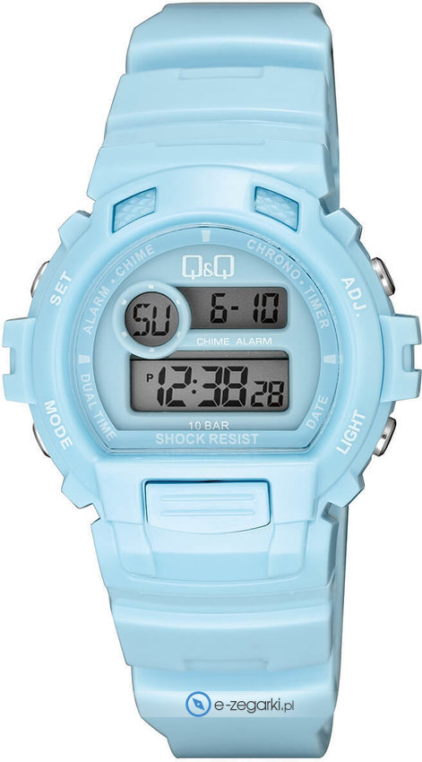 Zegarek damski G14A-001V marki Q&Q to idealne połączenie funkcjonalności a także modnego designu. Atrakcyjny wygląd czasomierza osiągnięto również dzięki tarczy w kolorze niebieskim. Pokazana metodą cyfrową aktualna godzina jest czytelna i szybka do sprawdzenia. Koperta jest w kolorze niebieskim szeroka jest na 41 mm oraz ma grubość 14 mm - w kształcie okrągłym.