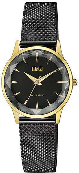 Model Q08A-004P marki Q&Q to stylowy zegarek naręczny damski, który wyposażono w ciekawe rozwiązania oraz funkcje. Wysokiej trwałości cyferblat zegarka pokryto czarnym kolorem. Zegarek ten prezentuje godzinę w formacie analogowym dzięki temu odczyt jest intuicyjny. Koperta w barwach koloru złotego szeroka jest na 30 mm oraz ma grubość 8.5 mm - cechuje się okrągłym kształtem.