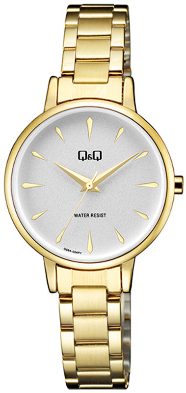 Model Q56A-004P marki Q&Q to gustowny zegarek naręczny damski, który posiada ciekawe rozwiązania oraz funkcje. Wysokiej trwałości cyferblat zegarka pokryto białym kolorem. Aktualna godzina prezentowana jest w sposób analogowy co niezmiernie łatwo pozwala ją odczytać. Koperta jest w kolorze złotym szeroka jest na 32 mm oraz ma grubość 8 mm - charakteryzuje się okrągłym kształtem.