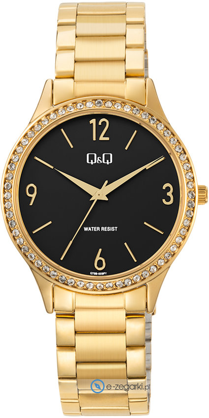 Damski zegarek Q&Q Q75B-009P to zegarek, który dzięki swemu wzornictwu zawsze będzie prezentował się dobrze. Styl zapewnia wysokiej klasy cyferblat w kolorze czarnym. Godzina prezentowana jest w sposób analogowy co bez trudu pozwala ją odczytać. Koperta w odcieniach koloru złotego szeroka jest na 34 mm oraz ma grubość 8 mm - w kształcie okrągłym.