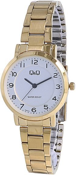 Model Q945-813 marki Q&Q to elegancki zegarek naręczny damski, który wyposażono w pomysłowe rozwiązania oraz funkcje. Ciekawą budowę czasomierza osiągnięto z pomocą tarczy w kolorze białym. Godzina pokazywana jest w sposób analogowy co bez trudu pozwala ją odczytać. Koperta jest w kolorze złotym szeroka jest na 30 mm - posiada okrągły kształt.