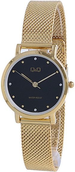 Damski zegarek Q&Q QA21-002 to zegarek, który dzięki swemu wzornictwu zawsze będzie prezentował się dobrze. Cyferblat zegarka w kolorze czarnym. Godzina pokazywana jest w sposób analogowy co bez trudu pozwala ją odczytać. Koperta została ozdobiona kolorem złotym szeroka jest na 30 mm oraz ma grubość 7.3 mm - posiada okrągły kształt.