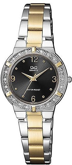 Zegarek damski QA29-405 marki Q&Q to stylowe połączenie funkcjonalności oraz modnego wzornictwa. Charakterystyczny wygląd czasomierza osiągnięto m.in. poprzez tarczę w kolorze czarnym. Zaprezentowana metodą analogową bieżąca godzina jest czytelna i szybka do sprawdzenia. Koperta została ozdobiona kolorem złotym.