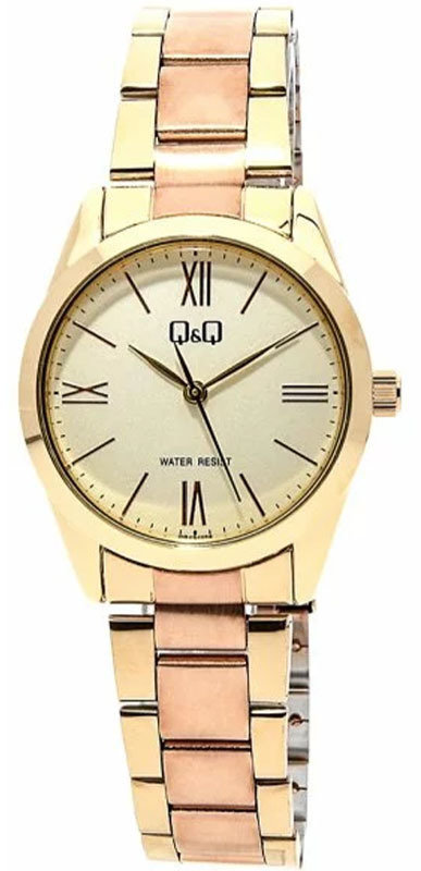 Zegarek damski QB43-408 marki Q&Q to idealna propozycja dla osób ceniących sobie dbałość o detale oraz bezawaryjne zachowanie mechanizmów. Zegarek ten pokazuje aktualny czas w formacie analogowym dzięki czemu odczyt jest intuicyjny. Koperta została pokryta kolorem złotym szeroka jest na 30 mm oraz ma grubość 8.90 mm - w kształcie okrągłym.