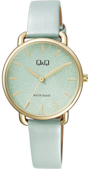 Zegarek damski QC27-102 marki Q&Q to ciekawa pozycja dla ludzi ceniących sobie dbałość o detale jak również bezproblemowe zachowanie mechanizmów. Wysokiej jakości cyferblat zegarka ozdobiono zielonym kolorem. Godzina zaprezentowana jest w sposób analogowy co bez trudu pozwala ją odczytać. Koperta jest pokryta kolorem złotym szeroka jest na 35 mm oraz ma grubość 9 mm - w kształcie okrągłym.