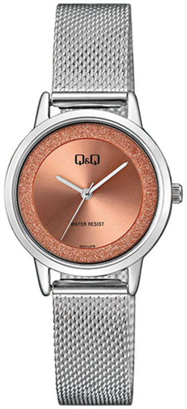 Model QZ57-278 marki Q&Q to stylowy zegarek naręczny damski, który wyposażono w pomysłowe rozwiązania oraz funkcje. Stylu nadaje wysokiej jakości tarcza w kolorze różowym. Aktualna godzina prezentowana jest w sposób analogowy co intuicyjnie pozwala ją odczytać. Koperta w odcieniach koloru srebrnego szeroka jest na 30 mm oraz ma grubość 8 mm - w kształcie okrągłym.