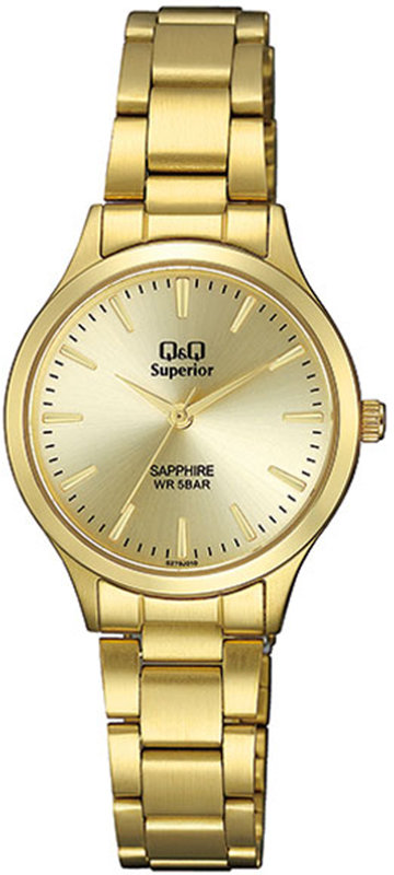 Zegarek damski S279-010 marki Q&Q to dobra propozycja dla ludzi ceniących sobie dbałość o szczegóły oraz bezproblemowe działanie mechanizmów. Niebanalny wygląd czasomierza osiągnięto m.in. poprzez tarczę w kolorze złotym. Zegarek ten prezentuje aktualny czas w formacie analogowym dzięki temu odczyt jest intuicyjny. Koperta w odcieniach koloru złotego szeroka jest na 30 mm oraz ma grubość 7.5 mm - ma okrągły kształt.