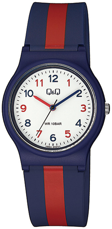 Zegarek V06A-002V zasilany jest bateryjnie - ogniwo kwarcowe. Pasek w tonacji koloru niebieskiego zrobiony jest z wysokiej jakości tworzywa sztucznego.