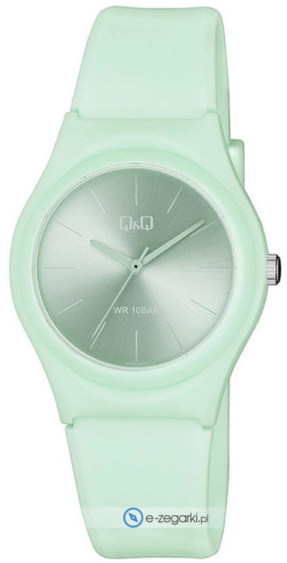 Damski zegarek Q&Q VQ86-055 to zegarek, który dzięki swemu wzornictwu zawsze będzie prezentował się dobrze. Wysokiej jakości tarczę zegarka pokryto zielonym kolorem. Zegarek ten prezentuje godzinę w formacie analogowym dzięki czemu odczyt jest bardzo łatwy. Koperta w barwach koloru zielonego szeroka jest na 34 mm oraz ma grubość 10 mm - posiada okrągły kształt.