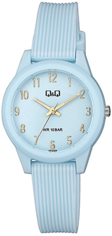 Zegarek damski VS13-006 marki Q&Q to dobre połączenie funkcjonalności i modnego designu. Charakterystyczną budowę zegarka osiągnięto z pomocą tarczy w kolorze niebieskim. Godzina pokazywana jest w sposób analogowy co niezmiernie łatwo pozwala ją odczytać. Koperta jest w kolorze niebieskim szeroka jest na 32 mm oraz ma grubość 10 mm - w kształcie okrągłym.