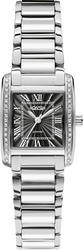 Model 507845 45 53 50 marki Roamer to elegancki zegarek naręczny damski, który posiada ciekawe rozwiązania i funkcje. Tarcza zegarka w kolorze czarnym. Koperta została ozdobiona kolorem stalowym szeroka jest na 16 mm oraz ma grubość 7 mm - posiada prostokątny kształt.